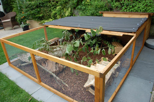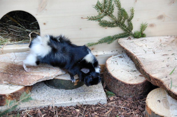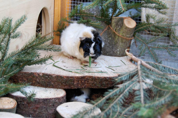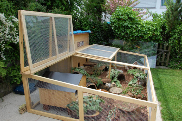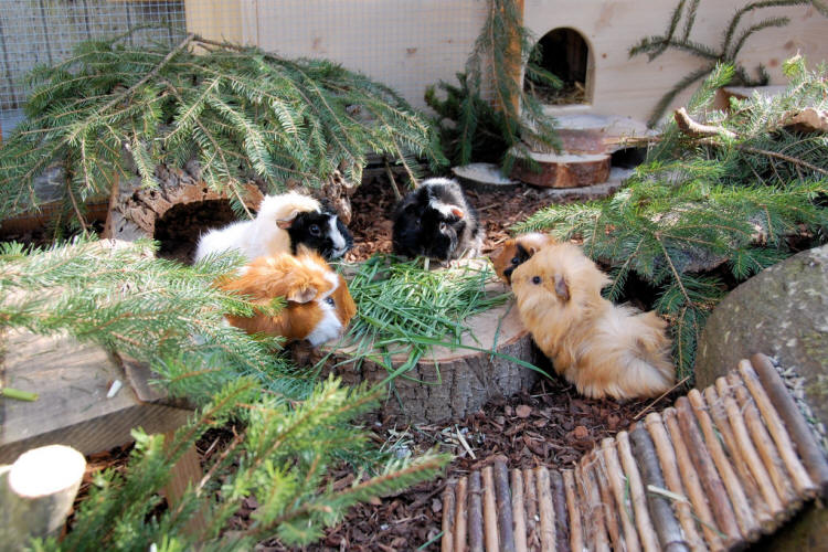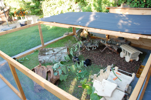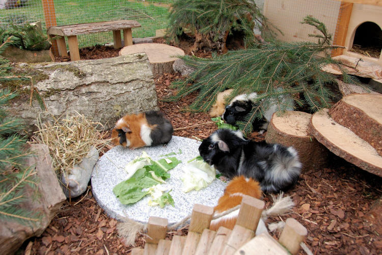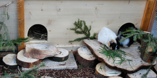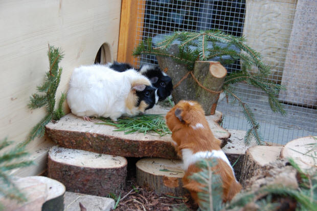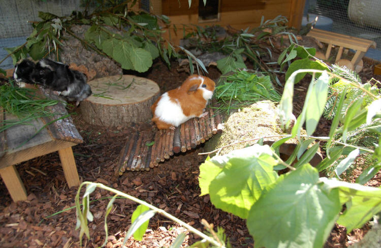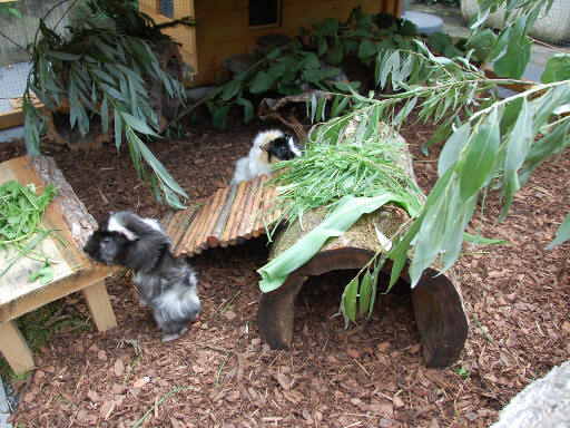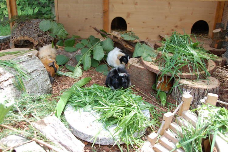 Hier können unsere Meeris nach Herzenslust rennen, spielen, klettern und fressen. Natürlich wird das Gehege normalerweise nach oben sicher mit einem vergitterten Deckel verschlossen! |