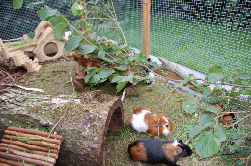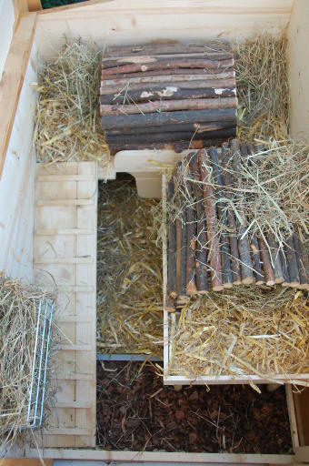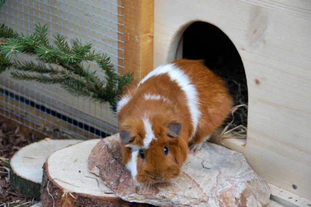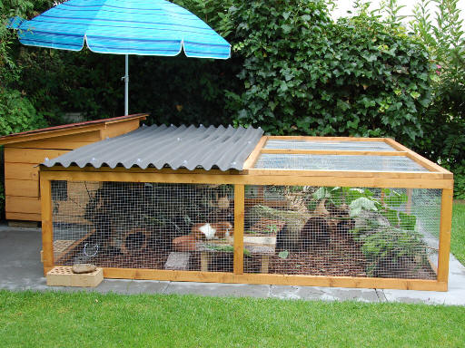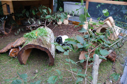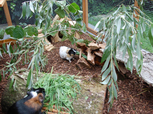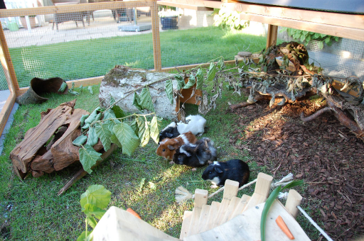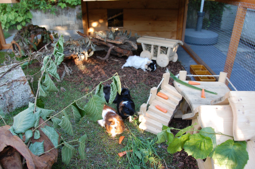 August 2010 Nach knapp einem Monat war bereits alles Gras weggefuttert - deshalb wurde es jetzt komplett mit Holzschnitzeln eingestreut. Bei schlechtem Wetter war das sonst einfach zu nass und dreckig! ![]() ![]() Auch viele Verstecke dürfen nicht fehlen. Da Meerscheinchen Fluchttiere sind, fühlen sie sich nur wohl, wenn immer ein sicheres Versteck in der Nähe ist. |