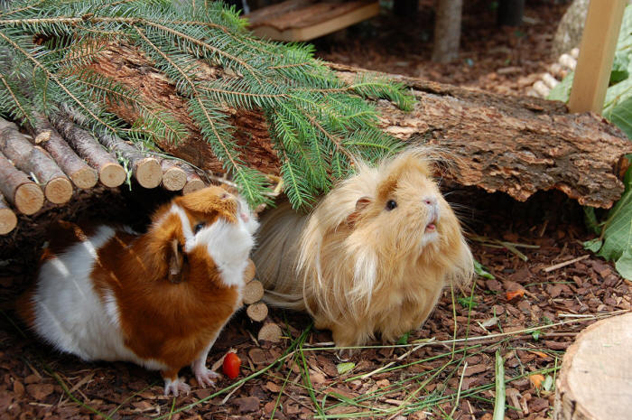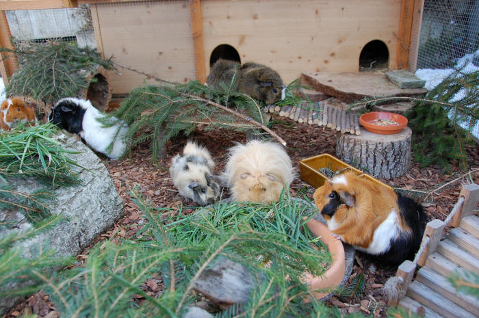1. Dezember 2012 Unseren Buben geht es allen sehr gut. Nur dem Zweibein fehlt immer wieder die Zeit, die Homepage regelmässig zu aktualisieren! Doch nun gibt es endlich wieder ein paar News: Schnell war der Oktober-Schnee wieder weg und die Temperaturen waren angenehm. Eine gute Gelegenheit, um das ganze Gehege wieder einmal gründlich zu putzen und mit frischen Holzschnitzeln einzustreuen, bevor nun der nächste Schnee kam. Hier ein paar Fotos, die noch vor diesem erneuten Kälteeinbruch entstanden sind: ![]() Natürlich gab's auch wieder frische Aeste zum knabbern :-) ![]() Rudelchef Robby, Filou und die zwei Jüngsten des Rudels! Weitere Fotos gibt's in der Meeri-Galerie! 29. Oktober 2012 Ende Oktober und tiefster Winter! ![]() Unglaublich, wie viel Schnee über dieses letzte Oktober-Wochenende gefallen ist! ![]() Dank schützendem Dach, haben's die Meeris zum Glück trotzdem trocken in ihrem Gehege! Und hier endlich mal wieder ein aktuelles Foto von Jerry! ![]() 6 Monate jung und schon richtig gross geworden :-)! Ein tolles Meersäuli! Sein «Hühnerfudi» ist bisher geblieben :-)))) - bin gespannt, wie er sich weiter entwickelt! Weitere Fotos gibt es in der Meeri-Fotogalerie! 22. Oktober 2012 Lange ist's her seit dem letzten Eintrag. Weiterbildung, viel Arbeit und zum Glück auch noch eine Woche Ferien, haben leider regelmässige Einträge verhindert. Aber die Hauptsache ist, dass alle Meeris wohlauf und fit sind :-)! Hier gibt es jetzt erst mal noch ein paar Fotos, die schon vor einer Weile aufgenommen wurden, es aber bis jetzt nicht ins Tagebuch geschafft haben: ![]() Nanu? Was ist das denn? Klein Jerry mit seinem «Hühnerfudi» beim Sprung vom Baumstammtunnel :-) ![]() ... und versteckt im Wichtelhäuschen! Jerry entwickelt sich prächtig. Ganz aktuelle Fotos folgen bald. ![]() Ein Teil des Rudels an einem der Futterplätze bei ihrer Lieblingsmahlzeit - frisches Gras! ![]() Klein Jerry und Filou! ![]() Toffy, Jerry und Filou! Weiter Fotos und News folgen demnächst! |