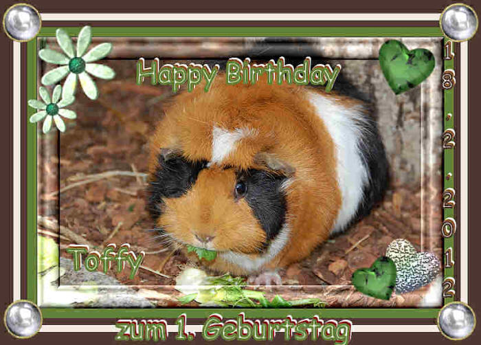18. Februar 2012 Schon wieder ein Geburtstag :-)! Heute feiert unser aufgeweckter Toffy seinen 1. Geburtstag! Er ist im letzten Frühling zusammen mit Filou bei uns eingezogen! ![]() Ein ganz herzliches Dankeschön an Ursula Binda, dass du mir diesen wunderschönen Bub anvertraut hast. Mit seiner aufgeweckten Art und seiner Zutraulichkeit ist er eine grosse Bereicherung in unserem Rudel. Nebst der grossen Freude über dieses tolle Meersäuli erinnern wir uns aber auch an die traurige Seite seiner Geburt. Ein Schwesterchen und der winzig kleine Bruder Piccolo haben leider nicht überlebt und ein paar Tage später ist auch sein Mami Lulu tragischerweise gestorben. Wir sind aber sehr glücklich, dass sich Toffy trotz der schwierigen Starbedingungen und dank Ursula's grossartiger Unterstützung so toll entwickelt hat. Glücklicherweise wurden er und sein Schwesterchen im Rudel von Ursula Binda von den anderen Meeris wie selbstverständlich «mitgetragen» :-)! |