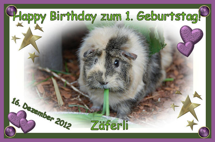 16. Dezember 2012 Wie schnell doch die Zeit vergeht! Unser zweitjüngster Bub feiert heute schon seinen 1. Geburtstag! Happy Birthday, lieber Zäferli! ![]() Danke liebe Barbara, dass du mir dieses tolle Meersäuli anvertraut hast! ![]() |
